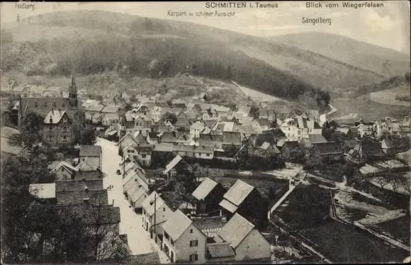 Schon nach wenigen Computer-Klicks fand ich das Farbfoto auf dem man, neben der katholischen Schmittener Felsenkirche St. Borromäus mit ihrem spitzen Turm, die beiden Anhöhen sieht, die auch auf dem alten Foto meines Großvaters zu erkennen sind, mit der Beschreibung: „Aussichtspunkt auf dem Wiegerfelsen auf Schmitten zu Füßen des Berges Pfaffenrod, daneben Sängelberg, nach rechts erhebt sich der Judenkopf, davor das Rathaus.“