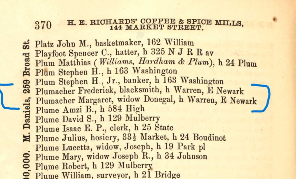 1832 heiratete sie (als Dienstmagd) in Solingen (NRW) den Seidenweber Peter Daniel Plümacher. Als sie sich als Witwe 1864 mit ihren Söhnen auf die weite Reise über den Atlantik aufmacht, einer noch ungewissen Zukunft entgegen, war sie 54 Jahre alt. 1866 und 1867 wird ihr Name unter dem ihres Sohnes Frederick „Fritz“ im Adressbuch der Stadt Newark genannt, mit dem Hinweis „Witwe des Donegal (Daniel) Plumacher.